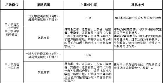 共招聘中小學事業編制教師83名。其中,初中語文7名、初中數學3名、初中英語3名、初中科學4名、初中社會11名、初中心理2名、小學語文①14名、小學語文②15名、小學數學15名、小學英語5名、小學科學3名、小學心理1名。具體招聘學校和招聘指標數詳見《寧波市海曙區教育局公開招聘2022學年事業編制中小學教師(第一批)招聘需求表》(附件1)。