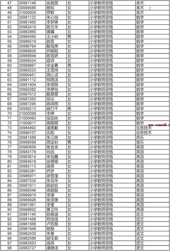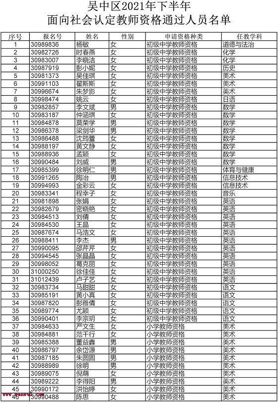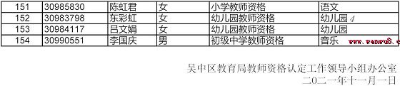 根據(jù)省、市教師資格認定工作的要求,按照網(wǎng)上申請、體格檢查、現(xiàn)場確認、犯罪記錄核查等相關(guān)程序,經(jīng)教師資格專家審查委員會審定,154人通過資格認定。現(xiàn)將認定結(jié)果予以公示(見附件),公示時間為2021年11月2日至11月8日。如有異議,請在公示期內(nèi)向蘇州市吳中區(qū)教育局人事科反映,聯(lián)系電話:67081181。