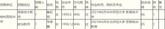 根據《柳州市教育局2020年赴區外普通高校招聘的公告》要求及安排,秦虹雨等2名同志經考核、體檢合格,符合聘用條件。經研究決定,擬聘用秦虹雨等2名同志為我單位工作人員,現予以公示,公示期7個工作日(2021年11月3日至2021年11月11日)。對擬聘用的同志如有異議,請以書面形式,并署真實姓名和聯系地址,于2021年11月11日前郵寄或直接送我單位(郵寄地址為:柳州市高新五路26號;郵編:545006,電話0772-2696608),群眾如實反映有關問題受法律保護。