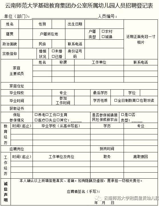 注:凡報名者都需要填寫《云南師范大學基教集團辦公室所屬幼兒園人員招聘登記表》與本人應聘材料一并遞交。
