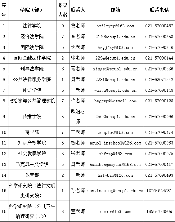 下載并填寫附件2中的《華東政法大學應聘人員登記表》,附上學術代表作掃描件,發送至相關學院(部)或研究機構聯系人郵箱,同時抄送huazhenghr@vip.163.com,郵件主題請標明“應聘學院(部)崗位姓名畢業院校”。