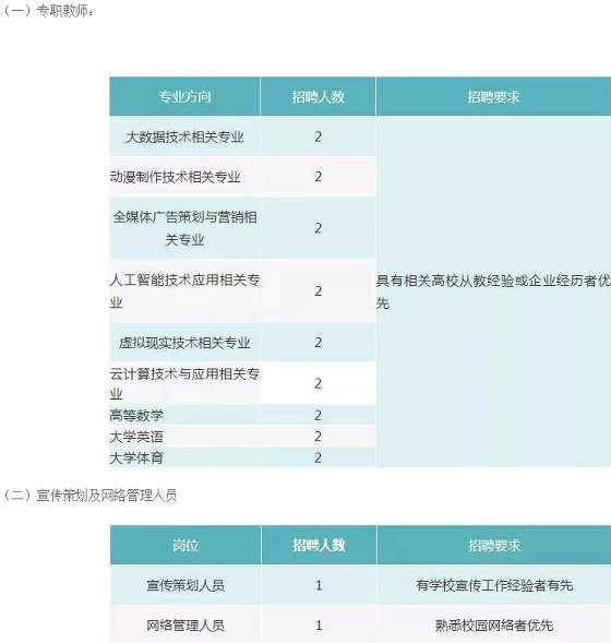 具有碩士學位,年齡不超過35周歲,具有良好的職業道德、較強的教學、科研能力和合作精神,身體健康。本科與碩士研究生階段所學專業相同或相近,英語通過國家四級。應聘英語教師崗位的人員應通過英語專業八級考試。任職要求1.具有相關高校從教經驗或企業經歷者優先;2.具備從事科研、教學工作的能力和素質;3.本碩專業一致或相近;4.能承擔相關專業課程的教學任務。