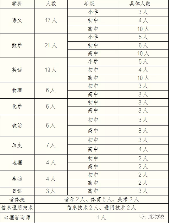 為了實(shí)現(xiàn)《頂興學(xué)校八年發(fā)展計(jì)劃》,頂興學(xué)校特向社會(huì)誠聘一批具有崇高的理想、遠(yuǎn)大的目標(biāo),敢思、敢想、敢拼、敢闖;堅(jiān)定理想信念,勇于擔(dān)當(dāng)作為,執(zhí)著于教書育人,有熱愛教育的定力,淡薄名利的堅(jiān)守,能夠吃苦耐勞,敢于攻堅(jiān)克難;借助頂興的平臺(tái)實(shí)現(xiàn)自己人生價(jià)值、體現(xiàn)自己的人生意義的教師。