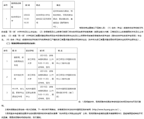 本次招聘由杭州市富陽區教育局赴高校組織現場宣講會和現場招聘會。