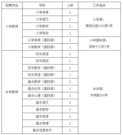 根據(jù)《上海市事業(yè)單位公開招聘人員辦法》(滬人社規(guī)〔2019〕15號(hào)),結(jié)合學(xué)校發(fā)展需要,按照公開、平等、競(jìng)爭(zhēng)、擇優(yōu)的原則,面向社會(huì)公開招聘中小學(xué)教師。