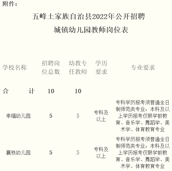 公開招聘城鎮幼兒園教師10名。招聘崗位見《五峰土家族自治縣2022年公開招聘城鎮幼兒園教師崗位表》(附后)。