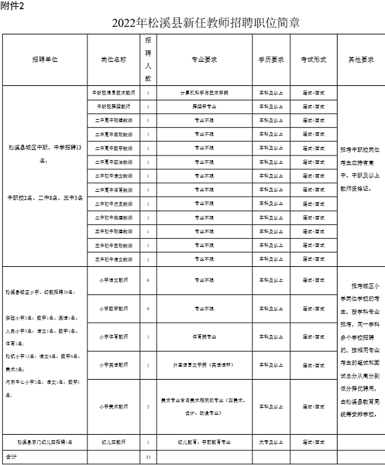 (三)2022年新招聘的教師實行“縣管校聘”,由教育局統籌安排學校。聘用后,必須在松溪縣服務五年方可調動。其中:城區小學和城區幼兒園新招聘的教師必須到鄉鎮小學和幼兒園支教三年。
