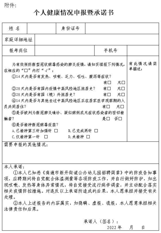 按目前疫情防控有關(guān)要求,考生須于考前至少14天申領(lǐng)“蘇康碼”并每天進(jìn)行健康申報(bào),考試當(dāng)天“蘇康碼”為綠碼且能提供考試開(kāi)考前48小時(shí)內(nèi)(以采樣時(shí)間為準(zhǔn),省內(nèi)外具有相關(guān)資質(zhì)認(rèn)定的檢測(cè)機(jī)構(gòu)均可)新冠肺炎病毒核酸檢測(cè)陰性證明(紙質(zhì)報(bào)告、電子報(bào)告或蘇康碼、檢測(cè)機(jī)構(gòu)APP顯示均可,必須含采樣時(shí)間信息),經(jīng)現(xiàn)場(chǎng)測(cè)量體溫低于37.3℃,并無(wú)干咳等異常癥狀的,方可進(jìn)入考點(diǎn)參加考試。應(yīng)聘人員須遵守疫情防控期間有關(guān)規(guī)定要求,除身份核驗(yàn)環(huán)節(jié)外,應(yīng)全程佩戴一次性醫(yī)用口罩,做好個(gè)人防護(hù)?荚嚠(dāng)天入場(chǎng)時(shí),考生應(yīng)主動(dòng)接受現(xiàn)場(chǎng)工作人員查驗(yàn),服從管理,提供《個(gè)人健康情況申報(bào)暨承諾書》見(jiàn)附件。
