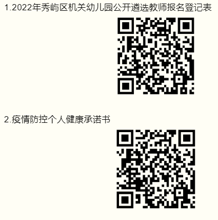 1.網上提交個人信息及材料。如實填寫《2022年秀嶼區機關幼兒園公開遴選教師報名登記表》(見附件1,自行下載填寫完整,并貼上近期免冠照片),并上傳個人身份證、畢業證(第一、最高學歷)、職務職稱證書、教師資格證、普通話等級證書。其中,免試考察對象須提交相關榮譽證書、獲獎證書證明等相關材料。符合條件的報考人員須將以上材料掃描成PDF格式發送至xyqjgy@126.com(郵件主題格式為“姓名+工作單位+手機號碼”)。