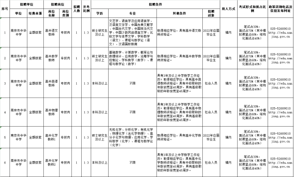 為加強我校教師隊伍建設,根據《江蘇省事業單位公開招聘人員辦法》(蘇辦發﹝2020﹞9號)精神,《南京市教育局部分直屬學校2022年6月公開招聘教師公告》(寧事招公告(R)﹝2022﹞38號)要求,南京市中華中學面向社會公開招聘6名編制內教師。現就有關事項公告如下: