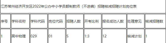 根據《江蘇常州經濟開發區2022年公辦中小學員額制教師(不進編)招聘公告》的要求,本次公開招聘報名工作結束后,部分招聘崗位因未達到開考比例,按規定予以核減崗位招聘計劃。