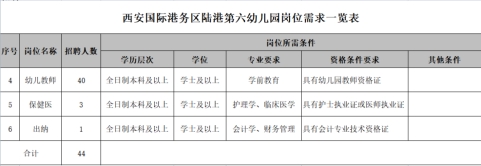 本次招聘采用“先面試、后筆試”的程序。招聘總數44人,其中幼兒教師40人,保健醫3人,出納1人,具體工作崗位、人數及其他要求詳見附件《西安國際港務區陸港第六幼兒園崗位需求一覽表》。