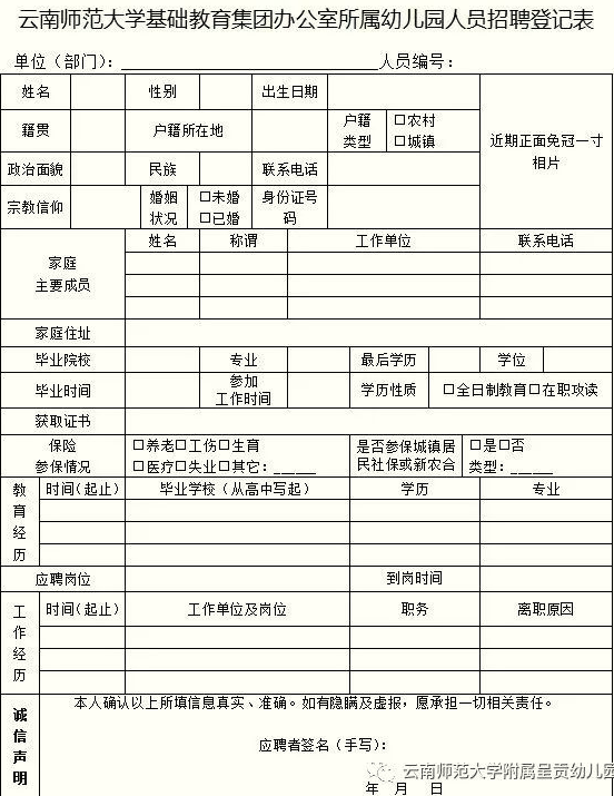 應(yīng)聘者按照招聘條件和要求,將自己的求職材料:自薦書(shū)、簡(jiǎn)歷、身份證原件、復(fù)印件和有關(guān)證明材料,《云南師范大學(xué)基教集團(tuán)辦公室所屬幼兒園人員招聘登記表》掃描件發(fā)送至郵箱326918729@qq.com進(jìn)行報(bào)名。