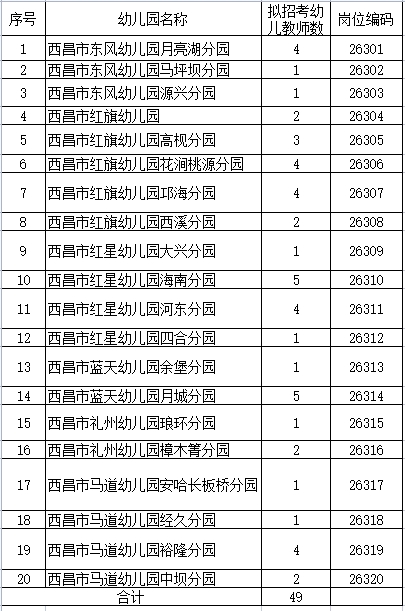 西昌市藍天幼兒園月城分園、西昌市藍天幼兒園余堡分園、西昌市紅星幼兒園四合分園、西昌市紅星幼兒園河東分園、西昌市紅星幼兒園海南分園、西昌市紅旗幼兒園邛海分園、西昌市紅旗幼兒園高枧分園、西昌市紅旗幼兒園、西昌市紅旗幼兒園花澗桃源分園、西昌市東風幼兒園馬坪壩分園、西昌市東風幼兒園丁家壩分園學歷需2022年7月以前普通高等院校全日制專科及以上學前教育專業畢業及以上。