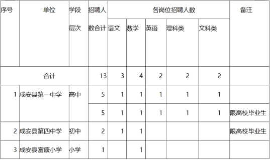 本次選聘高中、初中、小學(xué)教師共13名,部分崗位限高校畢業(yè)生報(bào)考,具體學(xué)科崗位為: