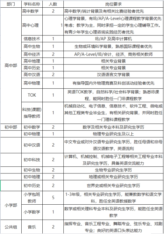 崗位2:上海中學國際部全英文教學的學科教師,涵蓋小學1年級到高中12年級