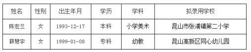 根據2023年昆山市教育系統公開招聘簡章,陳宏蘭、薛慧宇(人員信息附后)已通過昆山市教育局組織的筆試、面試、體檢(因懷孕緩檢)和考察,現進行錄用公示,公示時間為2023年7月26日~8月3日。如對公示對象有異議,可在公示期間向昆山市教育局反映,聯系電話:57553129。