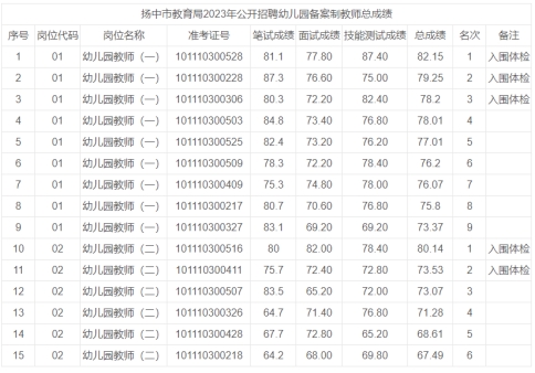 根據《揚中市教育局2023年公開招聘幼兒園備案制教師公告》(揚編外招公告〔2023〕2號)規定,現將考試總成績予以公布,如有異議請與揚中市教育局(0511—88323215)聯系。公示時間為2023年8月1日至8月3日。