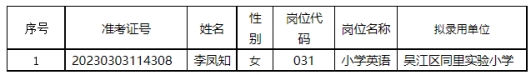 據《2023年蘇州市吳江區教育系統公開招聘教師公告》,經過考試、體檢、考核(政審)等程序,以下擬聘用人員予以公示。