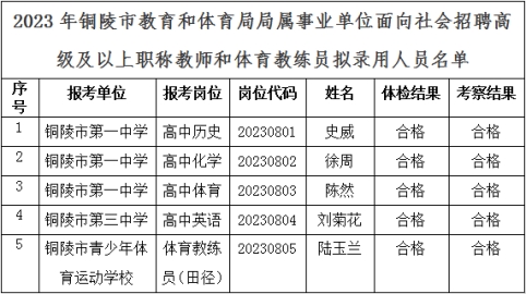 根據《2023年銅陵市教育和體育局局屬事業單位面向社會招聘高級及以上職稱教師和體育教練員公告》,經體檢和考察,現將2023年銅陵市教育和體育局局屬事業單位面向社會招聘高級及以上職稱教師和體育教練員擬錄用人員予以公示。