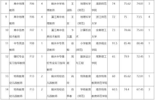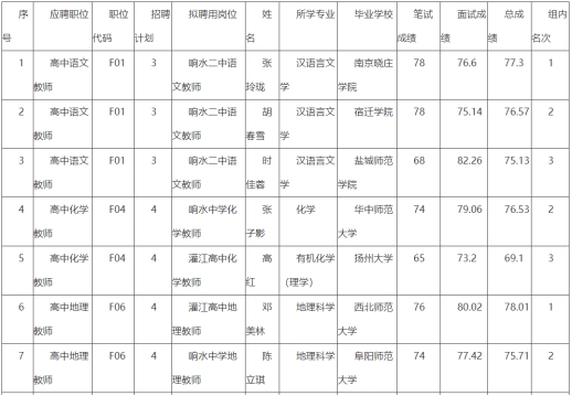 根據(jù)《響水縣教育系統(tǒng)事業(yè)單位2023年第二次公開招聘教師公告》,經(jīng)過報(bào)名、筆試、面試、體檢、考察等相關(guān)程序,擬聘用張玲瓏等14名同志。現(xiàn)將名單公示如下: