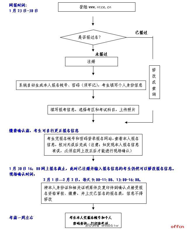 2013年上半年筆試報名采用網上報名信息輸入和現場確認相結合的辦法。其中,網上信息輸入時間為2013年1月23日9:00 -- 30日16:00,現場確認時間為2013年2月1日-2日,每天9:00-11:00、13:00-16:00。