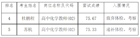 根據《丹徒區教育局所屬學校2024年“才薈丹徒”校園公開招聘教師公告》(鎮徒人社事招公告[2023]10號)規定,現將高中化學教師(02)崗位放棄及遞補入圍體檢、考察的人員予以公示。