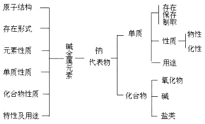 在學習完全章后應該指導學生總結出本章內容的知識網絡圖。這是學生學習的第一個金屬元素族,關鍵是熟悉自然族的學習方法。每一族重點掌握代表物質的性質,其他元素的性質可以利用相似性和遞變性的規律加以掌握。培養學生良好的學習習慣是很重要的。形成知識結構的網絡可以把分散的內容統一起來。為以后學習典型的非金屬元素族 鹵族鋪平道路,使得元素周期表和元素周期律的學習“水到渠成”。