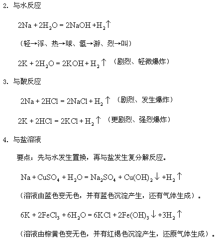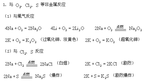 a.堿金屬都能與氧氣反應,從鋰到銫反應越來越劇烈,生成物為氧化物(鋰)、過氧化物(鈉)、比過氧化物更復雜的氧化物,如超氧化物等(鉀、銣、銫)。