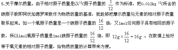 (3)每一個物理量都有它的標準?茖W上把0.012kg 12C所含的原子數定為1mol作為物質的量的基準。1mol的任何粒子的粒子數叫做阿伏加德羅常數。因此阿伏加德羅常數的近似值為6.02×1023mol-1,在敘述和定義時要用“阿伏加德羅常數”,在計算時取數值“6.02×1023mol-1”。