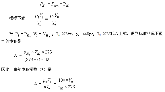 原理 用已知質量的鎂條跟過量的酸反應產生氫氣。把這氫氣的體積、實驗時的溫度和壓強代入理想氣體狀態方程(PV=nRT)中,就能算出摩爾氣體常數R的值。氫氣中混有水蒸氣,根據分壓定律可求得氫氣的分壓(p(H2)=p(總)-p(H2O)),不同溫度下的p(H2O)值可以查表得到。