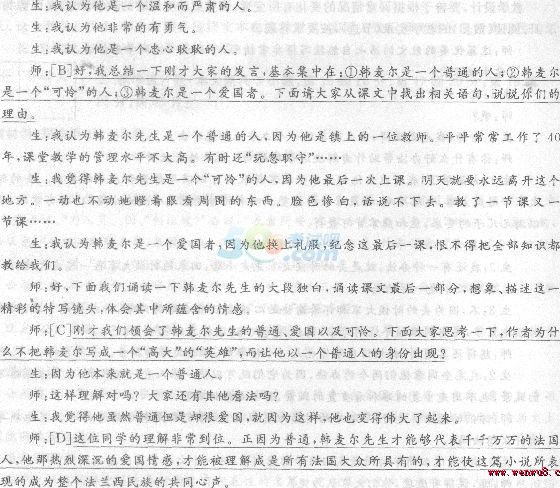 11.閱讀《最后一課》的教學實錄(節選),按要求答題(畫線語句的序號與選項的序號是對應的)。 師:[A]請大家思考一下:韓麥爾先生是一個怎樣的人?