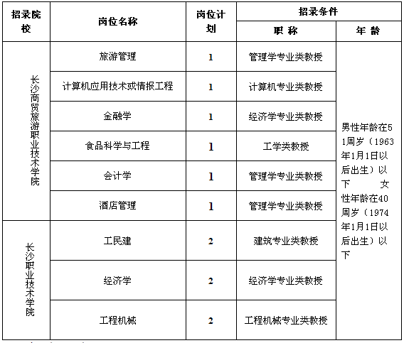 為實現長沙商貿旅游職業技術學院申辦應用型本科院校的發展目標,順利通過省示范性(骨干)高職院校的驗收,同時實現長沙職業技術學院創建優質特色示范高職學院的發展目標,根據《長沙市事業單位公開招聘人員辦法》及市政府的會議紀要(長府閱[2014]28號)“高層次人才引進計劃納入市引進緊缺急需和戰略型人才計劃”的精神,經研究,決定對長沙市教育局直屬的長沙商貿旅游職業技術學院、長沙職業技術學院共9個崗位面向社會公開招錄高層次人才。現將有關事項公告如下。