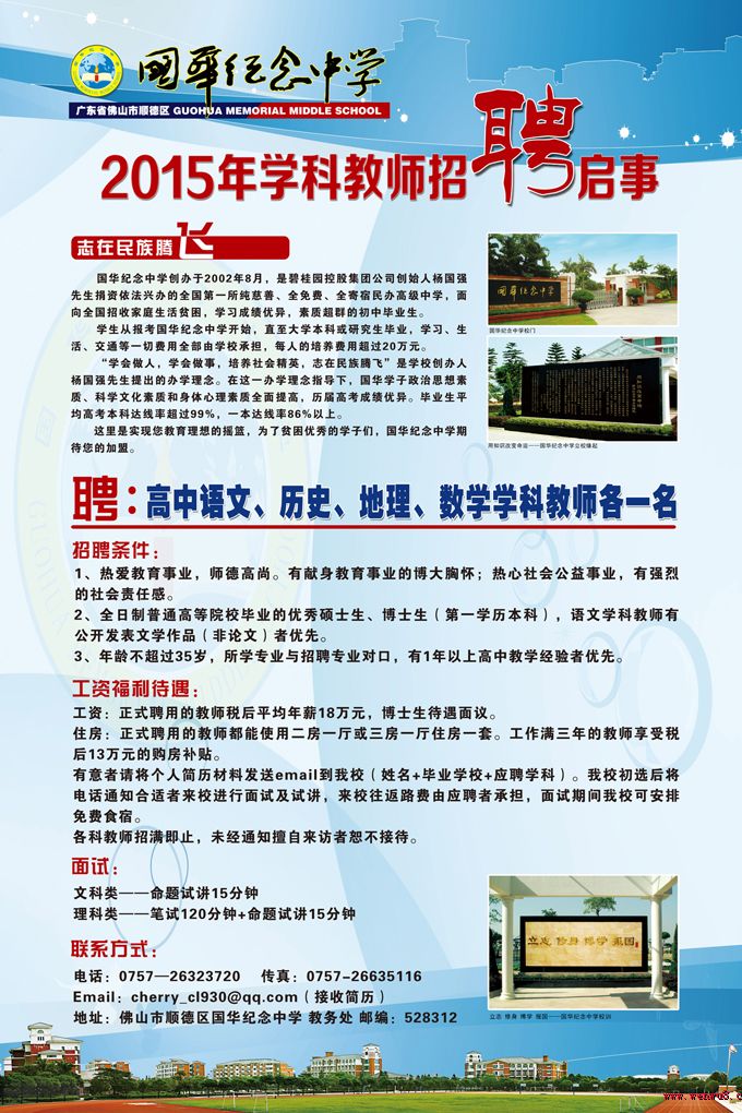 2015年廣東省佛山市順德區國華紀念中學教師招聘簡章
