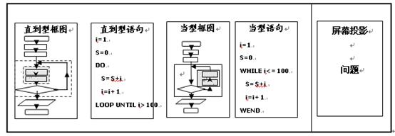 教師將直到型語句寫在直到型結構旁邊,并連線,告訴學生,這就是直到型循環語句。通過這樣的訓練,使學生意識到程序和框圖是一一對應的,寫程序只需把框圖翻譯成相應的語句即可。并且對循環語句有了一個大體的印象。可以培養學生的觀察能力和對比能力