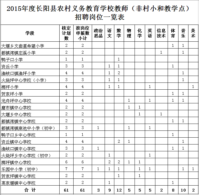 2015年度長陽縣農村義務教育學校教師招聘崗位匯一覽表