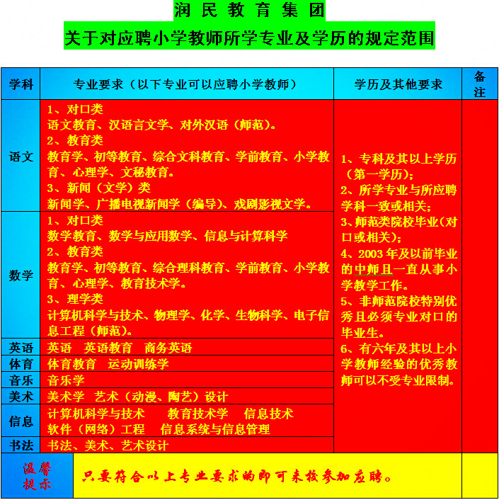 4、非師范類院優秀且專業對口的本科(所學專業與所應聘學科一致)及以上學歷畢業生。