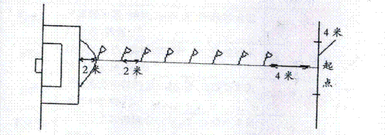 ②距罰球區(qū)線2米處起,沿20米垂線插置標(biāo)桿8根,每根桿間距離為2米,第8根桿距離起點(diǎn)4米,起點(diǎn)線長(zhǎng)度為4米,垂直于20米線并與起點(diǎn)相交。