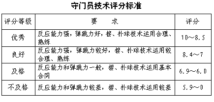 按四等級(jí)評(píng)分,各級(jí)評(píng)分分值詳見以下守門員技術(shù)評(píng)分標(biāo)準(zhǔn)。