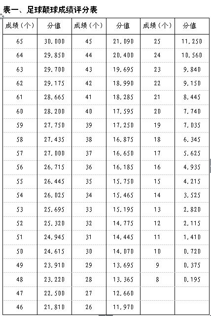 考生若按要求連續(xù)顛球65個(gè),可得滿分。成績(jī)及評(píng)分標(biāo)準(zhǔn)詳見表一