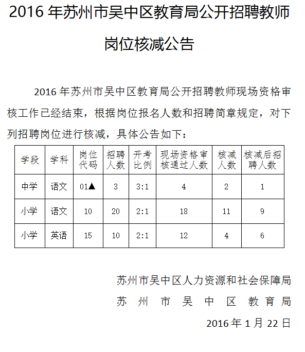 2016年江蘇省蘇州市吳中區教育局教師招聘崗位核減公告