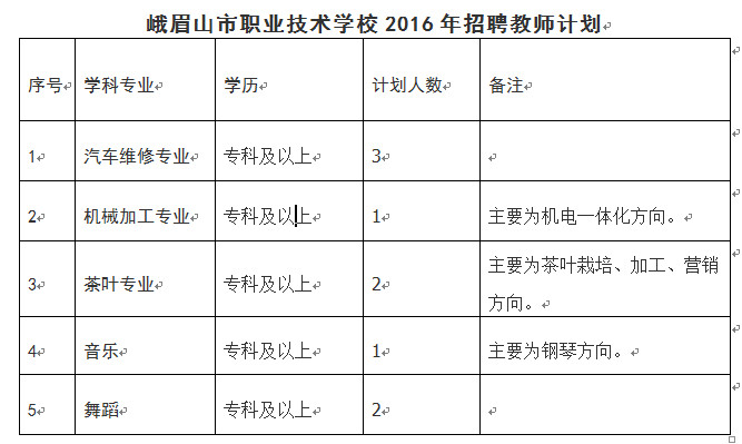 峨眉山市職業技術學校是一所公辦職業中學,學校位于峨眉山市綏山鎮,交通便捷,校園優美,是宜居宜學的理想之地。根據發展需要,學校決定遵照國家有關事業單位招聘人員的規定,公開、公平、公正面向社會招聘專業教師9名。