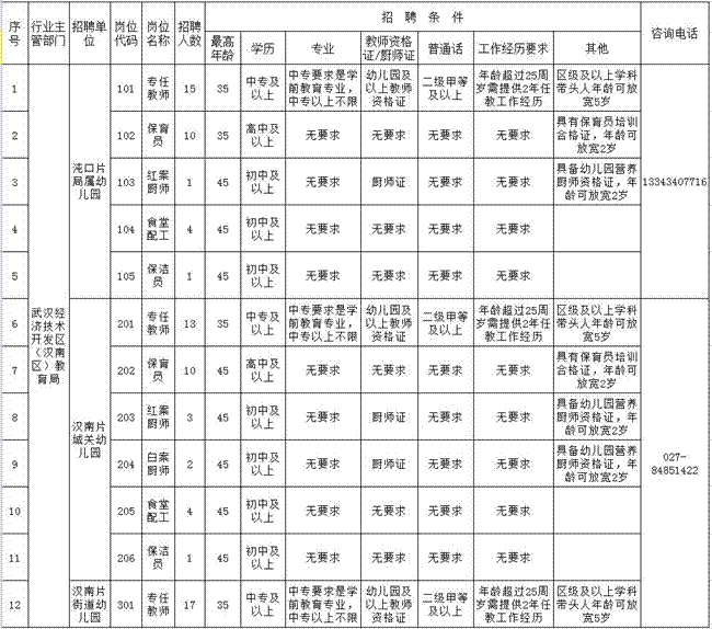 1.武漢開發區(漢南區)2016年招聘幼兒園教職工崗位一覽表;