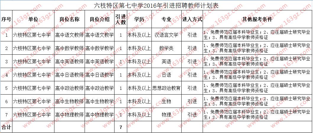 附:《六枝特區第七中學2016年引進招聘教師計劃表》