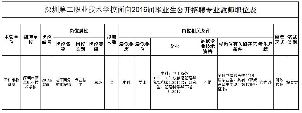 職位參見《深圳市第二職業技術學校面向2016屆畢業生公開招聘教師職位表》(以下簡稱《職位表》,見附件1)。