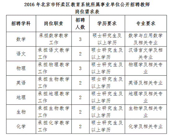 北京市懷柔區(qū)教育系統(tǒng)所屬事業(yè)單位(全額撥款事業(yè)單位),共招聘教師16人。