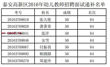 按照《關于對進入幼兒教師招聘面試范圍考生進行資格審查的通知》要求,經嚴格審查,有部分考生不符合條件,個別考生主動放棄資格,接受資格審查人員出現部分空缺,現根據《泰安高新區2016年幼兒教師招聘簡章》(以下簡稱《簡章》)規定,確定遞補人員,名單附后。