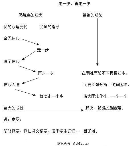 《走一步,再走一步》記敘了“我”童年的一次冒險和在父親的幫助下一步一步戰(zhàn)勝困難脫險的經(jīng)歷,告訴我們:困難和危險并不可怕,只要我們堅定信心、不怕它,將它分解為一個一個的小困難,從眼前腳下做起,就能個個擊破、戰(zhàn)勝它的道理。文章通過一個故事生發(fā)出人生感悟,引出一個富有哲理的道理,給人以啟發(fā)和教益。