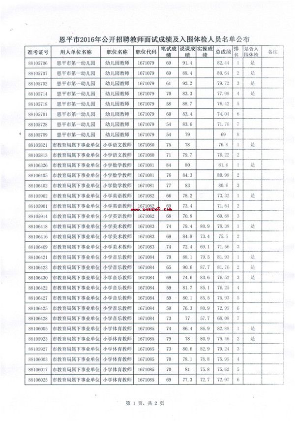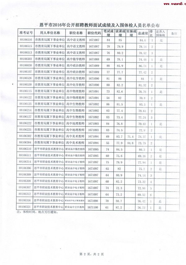 2016年廣東省恩平市教師招聘面試成績及入圍體檢人員名單公布