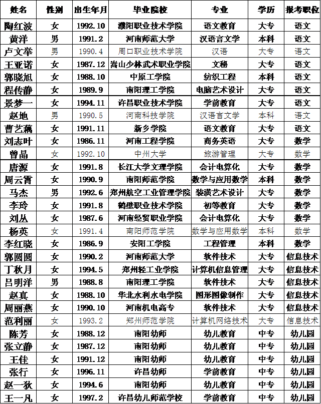 內鄉縣公開招聘山區教師工作領導小組辦公室公告(第6號) 根據《內鄉縣公開招聘山區教師工作實施方案》的有關規定,2016年公開招聘山區教師工作,經過筆試、面試、體檢、考核、已進行完畢,經研究,擬聘用黃洋等30位同志為教師。現將擬聘用人員名單予以公示,公示期七天,接受社會監督。 監督電話:0377----65333708 0377----65329189 0377----65333274 附:擬聘用人員名單